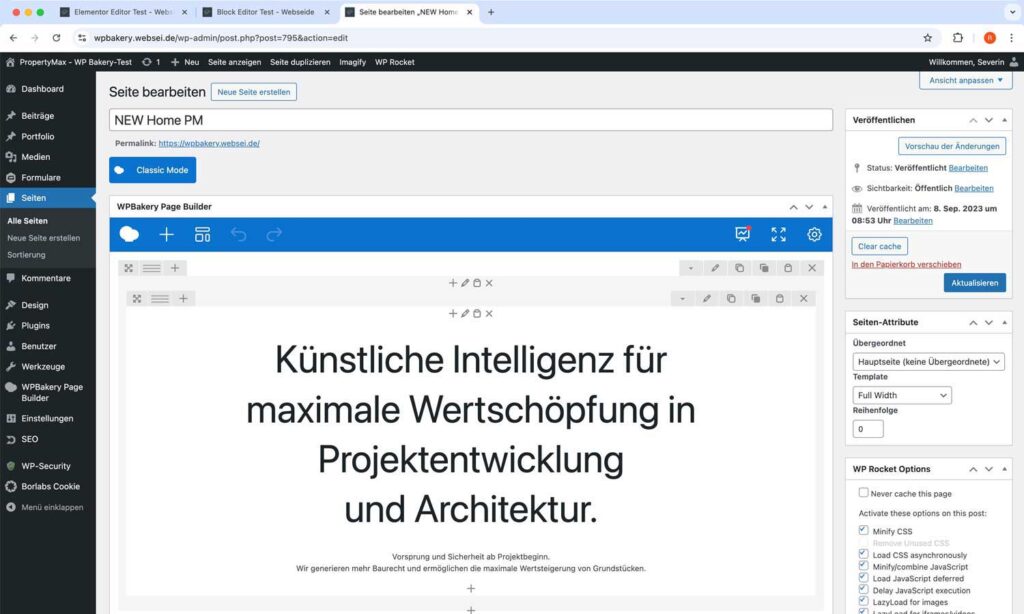 Um die drei Page Builder – Block Editor, Elementor und WPBakery – objektiv vergleichen zu können, haben wir mit jedem Tool dieselbe Startseite eines Kundenprojektes nachgebaut: Des SaaS-Anbieters PropertyMax. Hier können die drei Testsysteme begutachtet werden:
