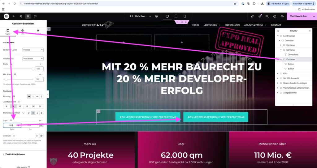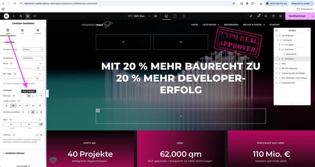 - Falls die Buttons nebeneinander zu eng erscheinen, stelle im Container-Layout die Richtung auf „Column“. Alternativ kannst du auch einen “Umbruch” einstellen. So werden sie automatisch untereinander angeordnet.