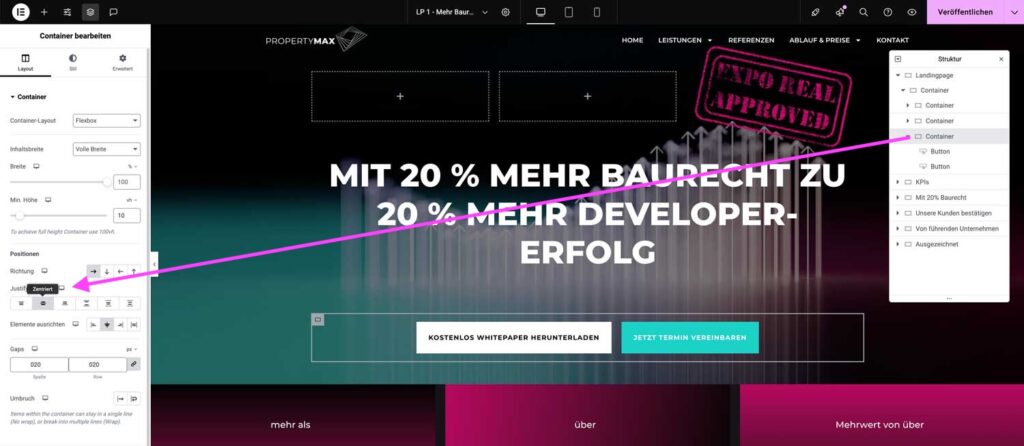 Wenn du möchtest, dass beide Buttons wirklich exakt auf einer Linie stehen, zum Beispiel bei unterschiedlicher Textlänge oder vertikalem Versatz, lohnt sich ein Blick auf die Ausrichtungseinstellungen des Containers.