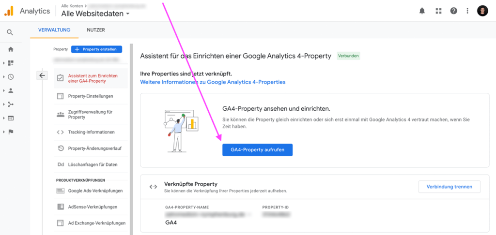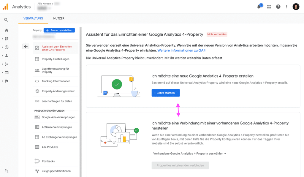 In der Regel legst du dazu ein neues Property an. Falls du GA4 aber schon eingerichtet hattest, kannst du das (nun) auch mit deinem Account verknüpfen (war bis vor Kurzem noch nicht möglich).