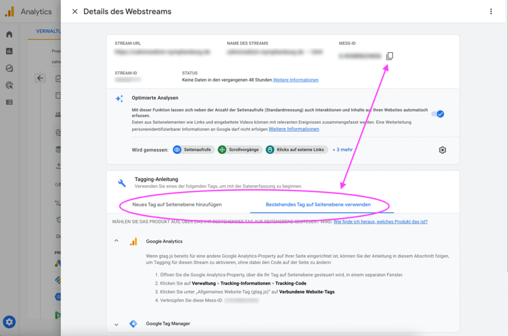 Im Bereich der Tagging-Anleitung wechselst du in den Tab „Bestehendes Tag auf Seitenebene verwenden“ und kannst dieser Anleitung folgen. Im Prinzip reicht es aber aus oben rechts die Mess-ID zu kopieren und anschließend in das bisherige UA-Analytics-Property zu wechseln.