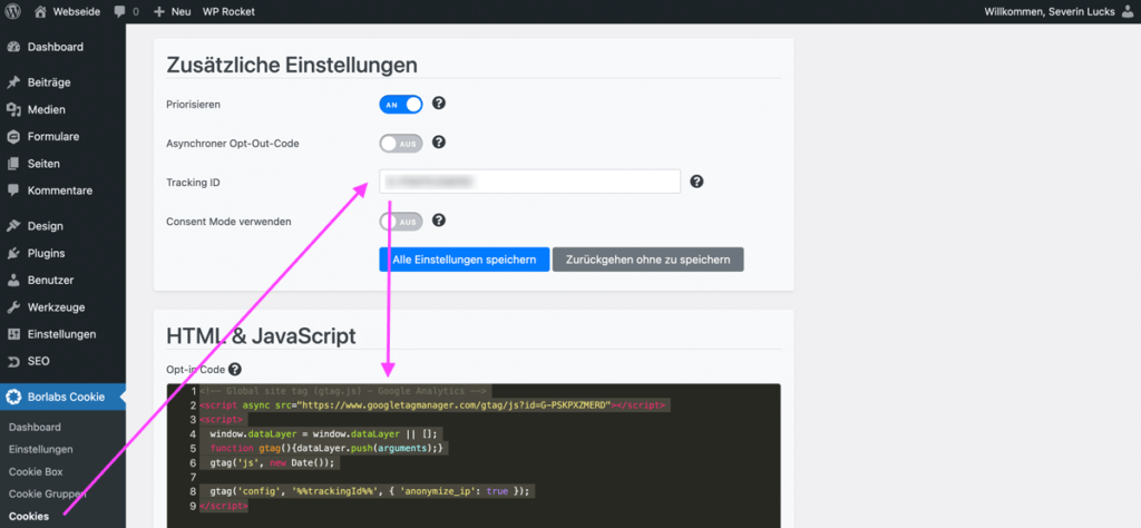 Dort kannst du bei der Tracking-ID die GA4-ID einfügen und anschließend statt des bisherigen Opt-in Codes den folgenden Code für Analytics 4 einsetzen, welcher schon die Funktion zur IP-Anonymisierung enthält: