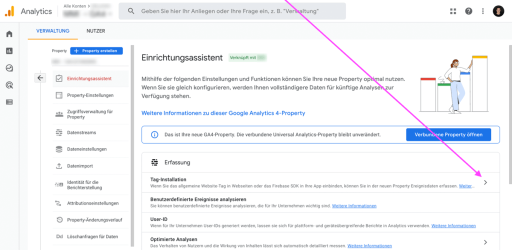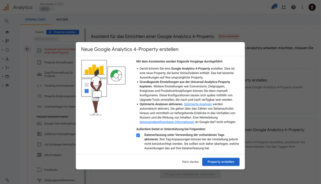 Wenn die Checkbox „Datenerfassung unter Verwendung der vorhandenen Tags aktivieren“ sichtbar und aktiviert ist bzw. aktiviert werden kann, ist nun GA4 mit dem bisherigen UA-Tracking eingerichtet. Falls die Checkbox nicht sichtbar oder aktivierbar ist, rufst du anschließend das „GA4-Property auf“ …