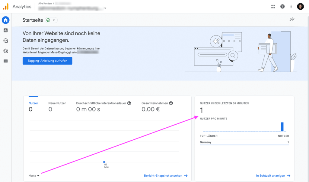 Um zu testen, ob die neue Statistik auch sauber funktioniert, öffnest du deine Website in einem Inkognito-Fenster und stimmst den Cookies im Banner zu. Anschließend kannst du in deinem anderen Browser-Fenster, wo du bereits eingeloggt bist, Analytics 4 aufrufen und als Zeitraum „Heute“ einstellen. Mit ein paar Sekunden Verzögerung solltest du dann Nutzerinnen in der Statistik erfasst bekommen: