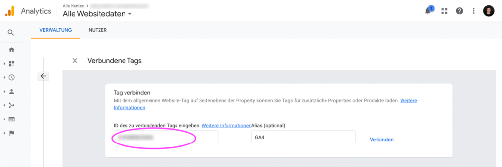 Danach kannst du links die GA4-Tracking-ID einfügen, optional rechts noch ein Kommentar hinterlegen und anschließend durch Klick auf Verbinden die Verknüpfung bestätigen: