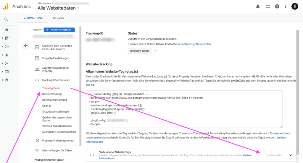 In Universal Analytics öffnest du die Einstellungen links unten über das Zahnrad-Icon („Verwaltung“) und gehst dann in der mittleren Spalte auf Tracking-Code. Anschließend öffnet sich eine große Spalte rechts, wo du nach unten scrollst und neben „Verbundene Website-Tags“ auf den Pfeil nach unten klickst: